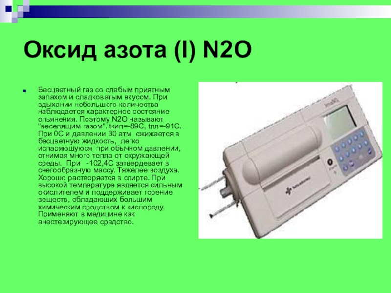 сладковатым вкусом. При вдыхании небольшого количества наблюдается характерное состояние опьянения. Поэтому N2O называют "веселящим газом". tкип=-89С, tпл=-91С. При 0С и давлении 30 атм сжижается в бесцветную жидкость, легко испаряющуюся при обычном давлении, отнимая много тепла от окружающей среды. При -102,4С затвердевает в снегообразную массу. Тяжелее воздуха. Хорошо растворяется в спирте. При высокой температуре является сильным окислителем и поддерживает горение веществ, обладающих большим химическим сродством к кислороду. Применяют в медицине как анестезирующее средство.