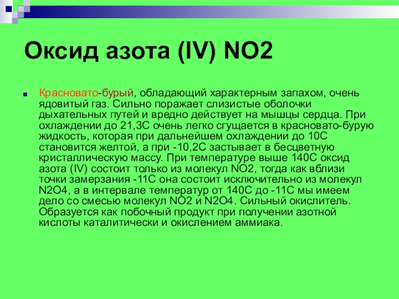 Сильно поражает слизистые оболочки дыхательных путей и вредно действует на мышцы сердца. При охлаждении до 21,3С очень легко сгущается в красновато-бурую жидкость, которая при дальнейшем охлаждении до 10С становится желтой, а при -10,2С застывает в бесцветную кристаллическую массу. При температуре выше 140С оксид азота (IV) состоит только из молекул NO2, тогда как вблизи точки замерзания -11С она состоит исключительно из молекул N2O4, а в интервале температур от 140C до -11С мы имеем дело со смесью молекул NO2 и N2O4. Сильный окислитель. Образуется как побочный продукт при получении азотной кислоты каталитически и окислением аммиака.