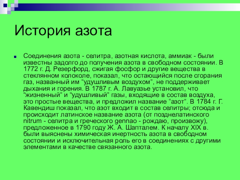 задолго до получения азота в свободном состоянии. В 1772 г. Д. Резерфорд, сжигая фосфор и другие вещества в стеклянном колоколе, показал, что остающийся после сгорания газ, названный им “удушливым воздухом”, не поддерживает дыхания и горения. В 1787 г. А. Лавуазье установил, что “жизненный” и “удушливый” газы, входящие в состав воздуха, это простые вещества, и предложил название “азот”. В 1784 г. Г. Кавендиш показал, что азот входит в состав селитры; отсюда и происходит латинское название азота (от позднелатинского nitrum - селитра и греческого gennao - рождаю, произвожу), предложенное в 1790 году Ж. А. Шапталем. К началу ХIX в. были выяснены химическая инертность азота в свободном состоянии и исключительная роль его в соединениях с другими элементами в качестве связанного азота.