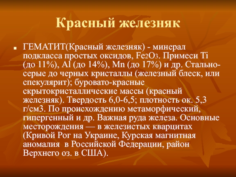 (до 11%), Al (до 14%), Mn (до 17%) и др. Стально-серые до черных кристаллы (железный блеск, или спекулярит); буровато-красные скрытокристаллические массы (красный железняк). Твердость 6,0-6,5; плотность ок. 5,3 г/см3. По происхождению метаморфический, гипергенный и др. Важная руда железа. Основные месторождения — в железистых кварцитах (Кривой Рог на Украине, Курская магнитная аномалия в Российской Федерации, район Верхнего оз. в США).