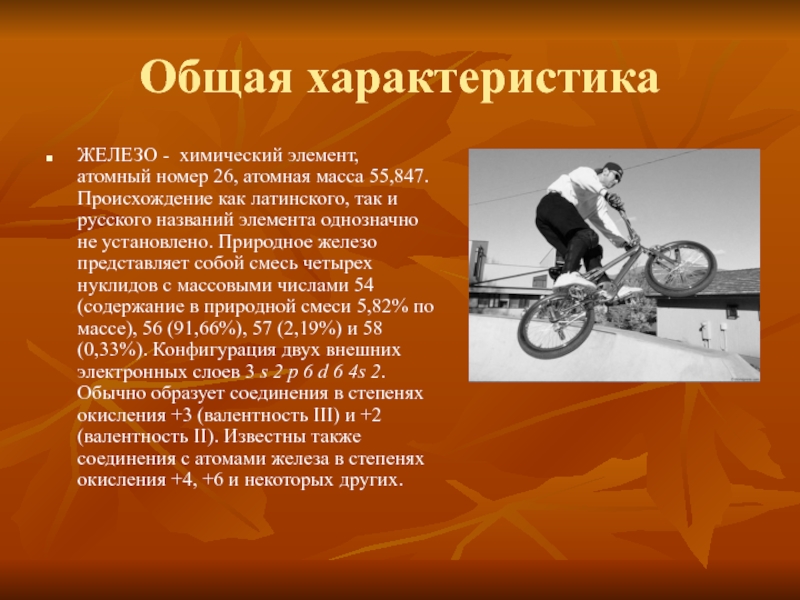Происхождение как латинского, так и русского названий элемента однозначно не установлено. Природное железо представляет собой смесь четырех нуклидов с массовыми числами 54 (содержание в природной смеси 5,82% по массе), 56 (91,66%), 57 (2,19%) и 58 (0,33%). Конфигурация двух внешних электронных слоев 3 s 2 p 6 d 6 4s 2. Обычно образует соединения в степенях окисления +3 (валентность III) и +2 (валентность II). Известны также соединения с атомами железа в степенях окисления +4, +6 и некоторых других.