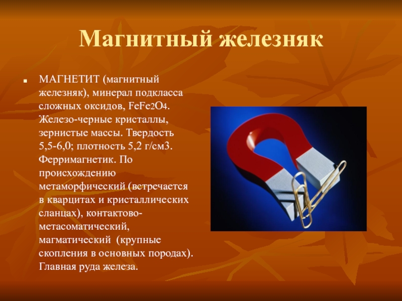 МАГНЕТИТ (магнитный железняк), минерал подкласса сложных оксидов, FeFe2O4. Железо-черные кристаллы,