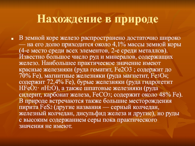 его долю приходится около 4,1% массы земной коры (4-е место среди всех элементов, 2-е среди металлов). Известно большое число руд и минералов, содержащих железо. Наибольшее практическое значение имеют красные железняки (руда гематит, Fe2O3 ; содержит до 70% Fe), магнитные железняки (руда магнетит, Fe3О4; содержит 72,4% Fe), бурые железняки (руда гидрогетит НFeO2· nH2O), а также шпатовые железняки (руда сидерит, карбонат железа, FeСО3; содержит около 48% Fe). В природе встречаются также большие месторождения пирита FeS2 (другие названия — серный колчедан, железный колчедан, дисульфид железа и другие), но руды с высоким содержанием серы пока практического значения не имеют.