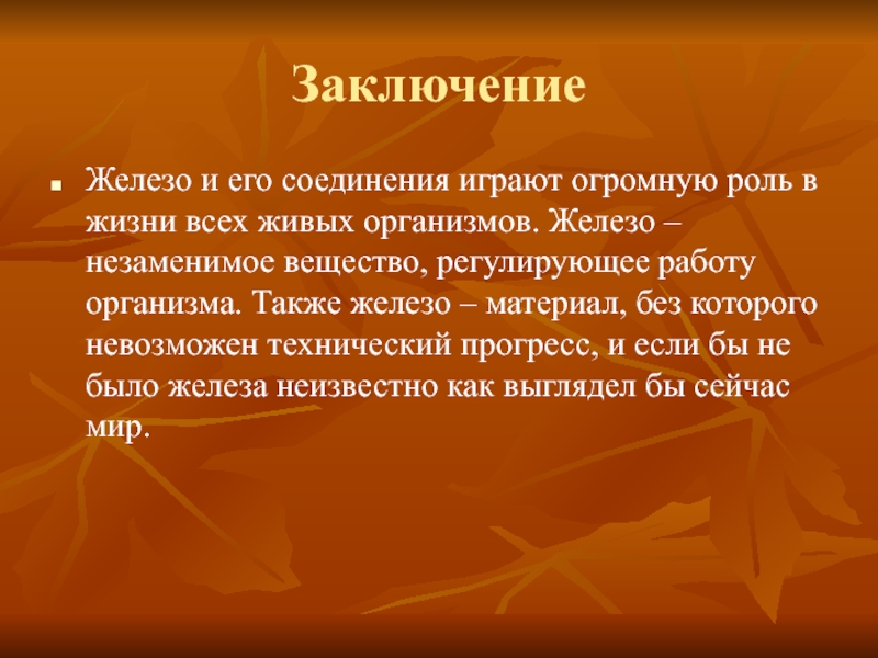 организмов. Железо – незаменимое вещество, регулирующее работу организма. Также железо – материал, без которого невозможен технический прогресс, и если бы не было железа неизвестно как выглядел бы сейчас мир.
