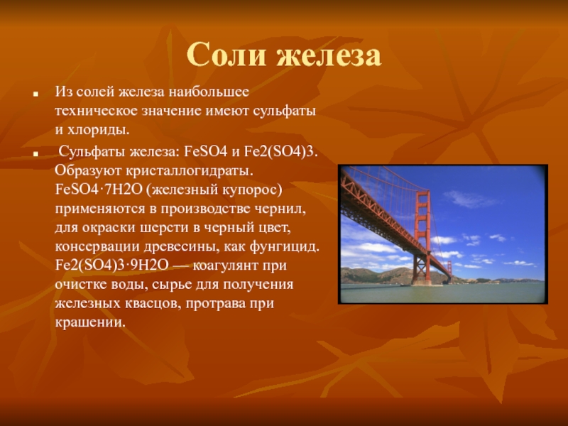 Из солей железа наибольшее техническое значение имеют сульфаты и хлориды.