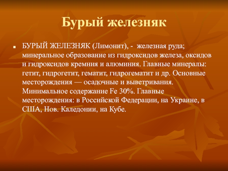 железа, оксидов и гидроксидов кремния и алюминия. Главные минералы: гетит, гидрогетит, гематит, гидрогематит и др. Основные месторождения — осадочные и выветривания. Минимальное содержание Fe 30%. Главные месторождения: в Российской Федерации, на Украине, в США, Нов. Каледонии, на Кубе.