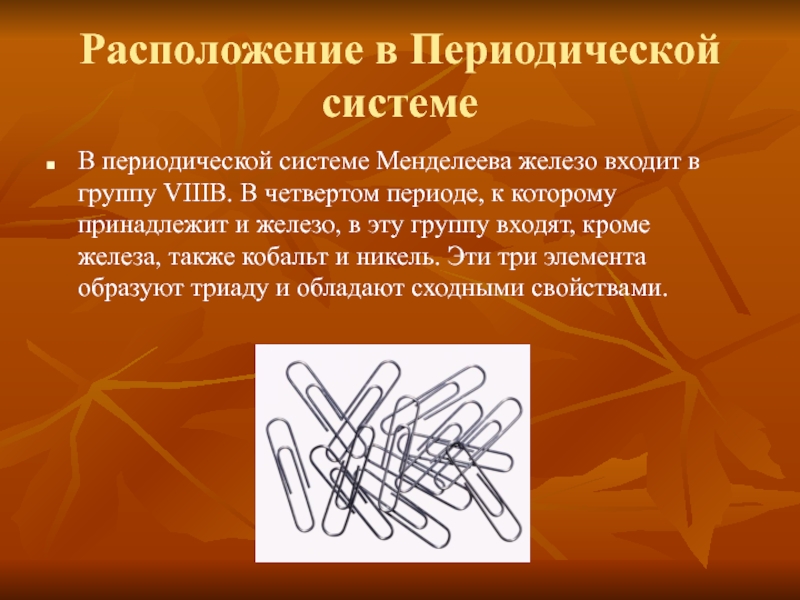 VIIIВ. В четвертом периоде, к которому принадлежит и железо, в эту группу входят, кроме железа, также кобальт и никель. Эти три элемента образуют триаду и обладают сходными свойствами.