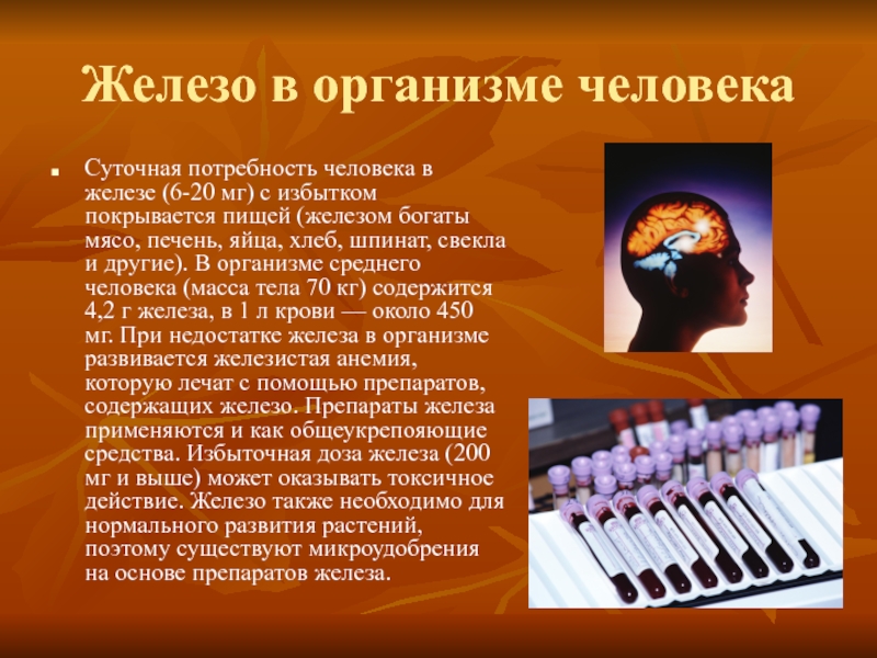 избытком покрывается пищей (железом богаты мясо, печень, яйца, хлеб, шпинат, свекла и другие). В организме среднего человека (масса тела 70 кг) содержится 4,2 г железа, в 1 л крови — около 450 мг. При недостатке железа в организме развивается железистая анемия, которую лечат с помощью препаратов, содержащих железо. Препараты железа применяются и как общеукрепояющие средства. Избыточная доза железа (200 мг и выше) может оказывать токсичное действие. Железо также необходимо для нормального развития растений, поэтому существуют микроудобрения на основе препаратов железа.