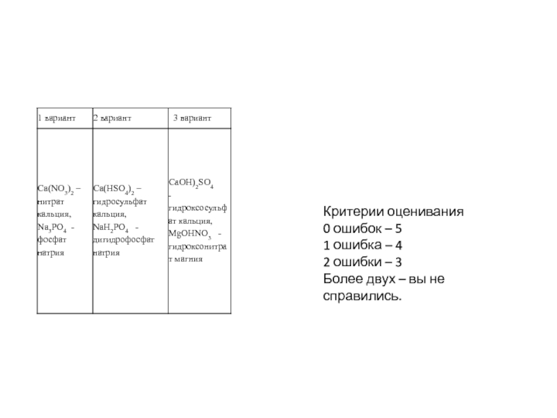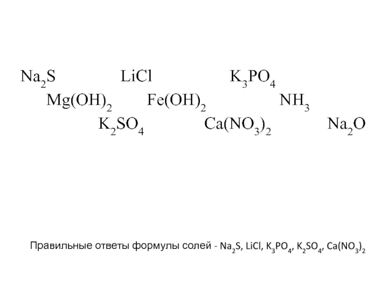 Правильные ответы формулы солей - Na2S, LiCl, K3PO4, K2SO4, Ca(NO3)2