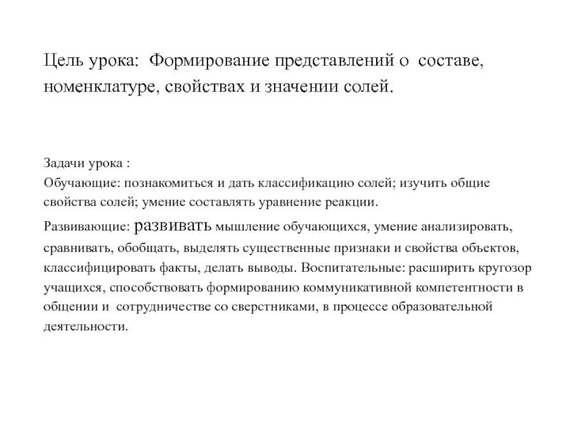 Обучающие: познакомиться и дать классификацию солей; изучить общие свойства солей; умение составлять уравнение реакции.
