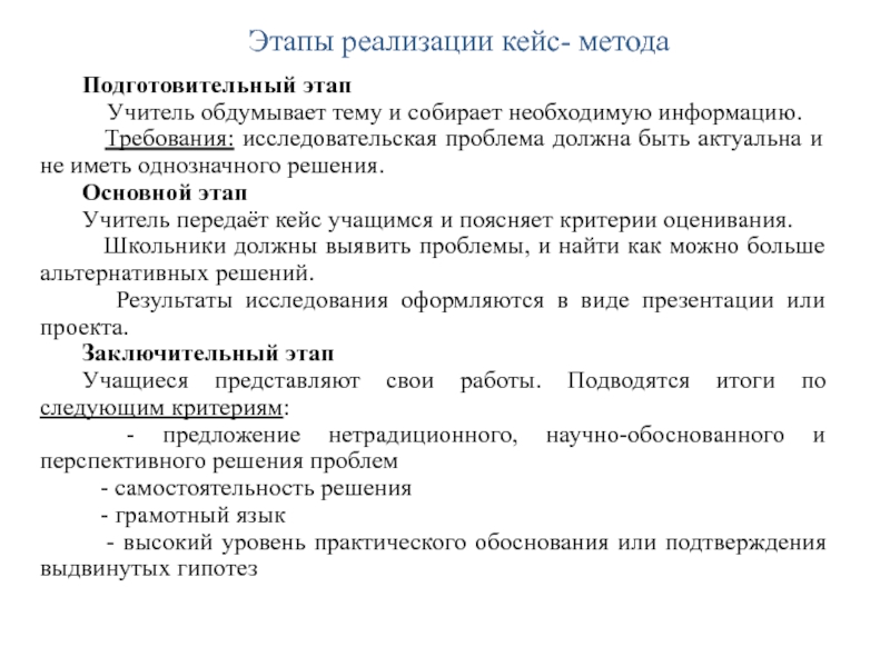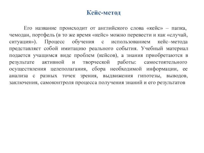портфель (в то же время «кейс» можно перевести и как «случай, ситуация»). Процесс обучения с использованием кейс–метода представляет собой имитацию реального события. Учебный материал подается учащимся виде проблем (кейсов), а знания приобретаются в результате активной и творческой работы: самостоятельного осуществления целеполагания, сбора необходимой информации, ее анализа с разных точек зрения, выдвижения гипотезы, выводов, заключения, самоконтроля процесса получения знаний и его результатов