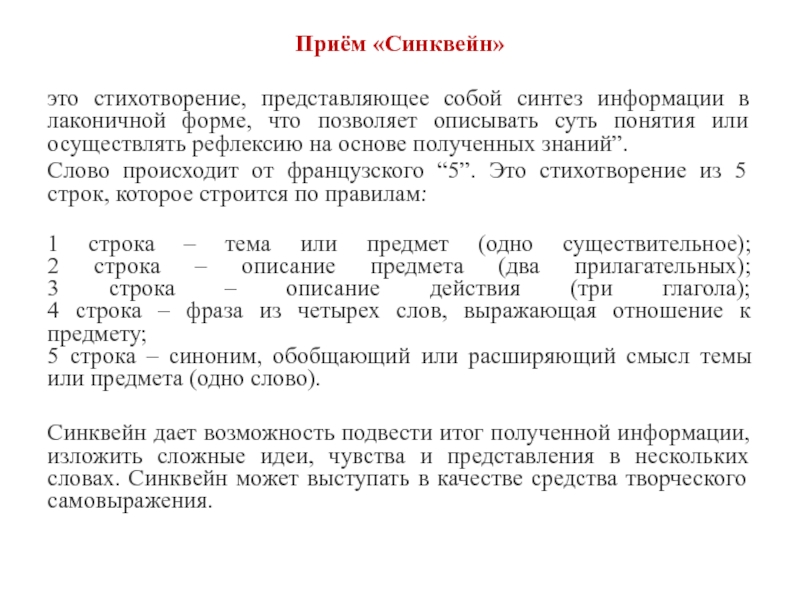 Синквейн дает возможность подвести итог полученной информации, изложить сложные идеи, чувства и представления в нескольких словах. Синквейн может выступать в качестве средства творческого самовыражения.