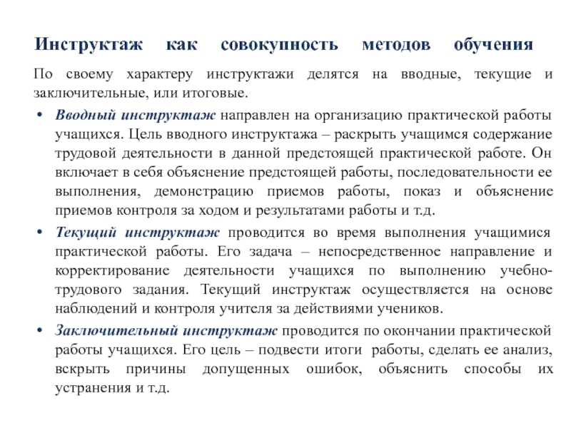 Заключительный инструктаж проводится по окончании практической работы учащихся. Его цель – подвести итоги работы, сделать ее анализ, вскрыть причины допущенных ошибок, объяснить способы их устранения и т.д.