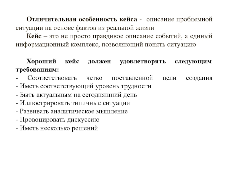 Слайд 49Отличительная особенность кейса - описание проблемной ситуации на основе фактов из