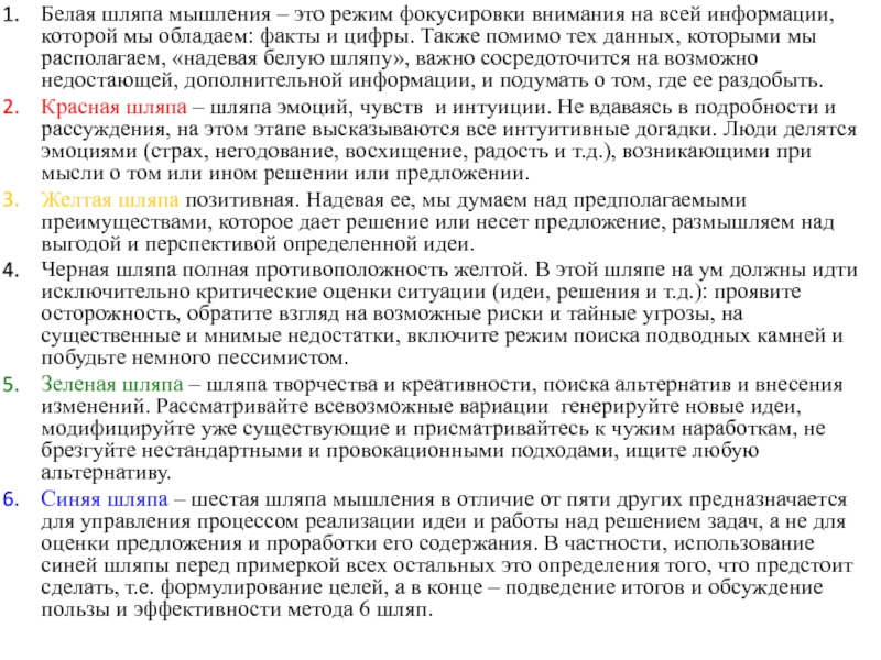 Слайд 44Белая шляпа мышления – это режим фокусировки внимания на всей информации,