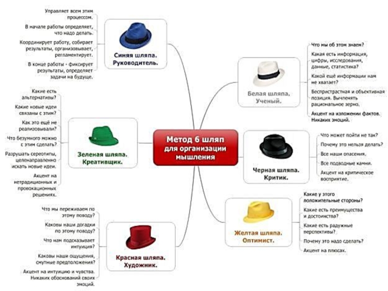 Зеленая шляпа – шляпа творчества и креативности, поиска альтернатив и внесения изменений. Рассматривайте всевозможные вариации генерируйте новые идеи, модифицируйте уже существующие и присматривайтесь к чужим наработкам, не брезгуйте нестандартными и провокационными подходами, ищите любую альтернативу.