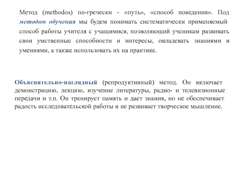 Слайд 7Метод (methodos) по-гречески - «путь», «способ поведения». Под методом обучения мы
