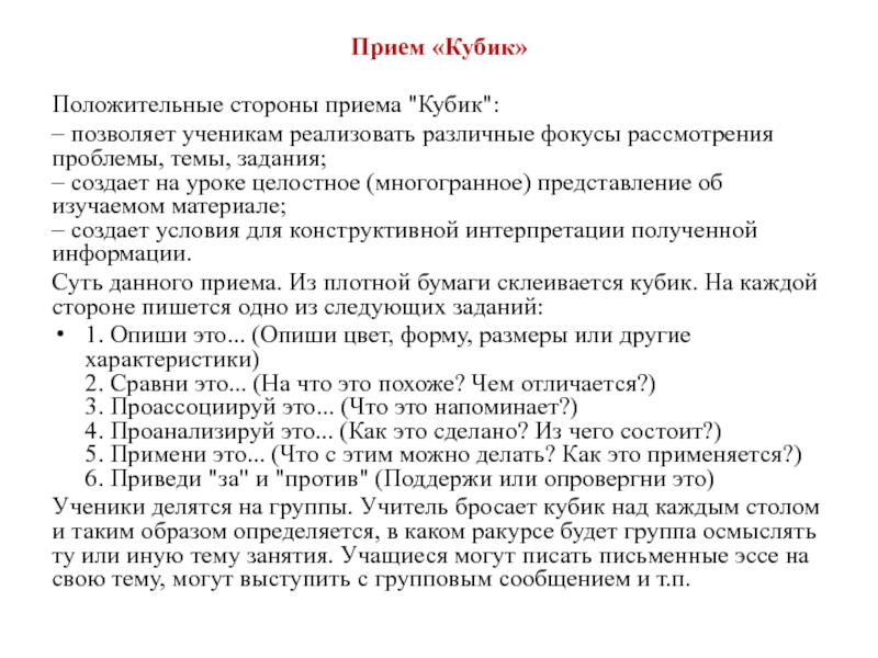 Ученики делятся на группы. Учитель бросает кубик над каждым столом и таким образом определяется, в каком ракурсе будет группа осмыслять ту или иную тему занятия. Учащиеся могут писать письменные эссе на свою тему, могут выступить с групповым сообщением и т.п.