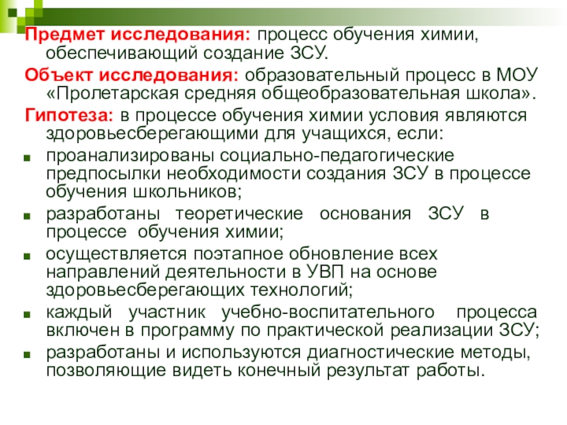 Предмет исследования: процесс обучения химии, обеспечивающий создание ЗСУ.