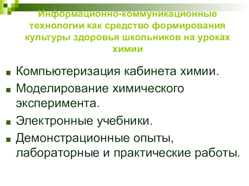 Слайд 11Информационно-коммуникационные технологии как средство формирования культуры здоровья школьников на уроках химии