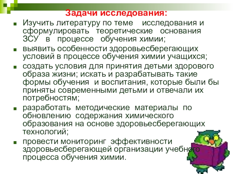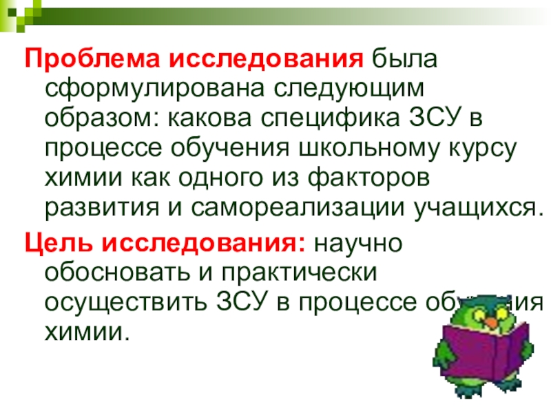Цель исследования: научно обосновать и практически осуществить ЗСУ в процессе обучения химии.