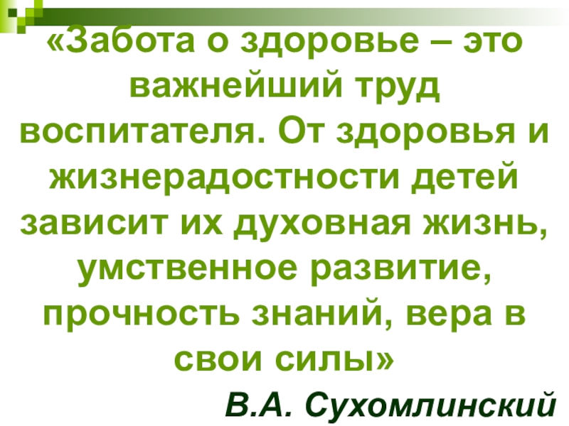 Слайд 2«Забота о здоровье – это важнейший труд воспитателя. От здоровья и