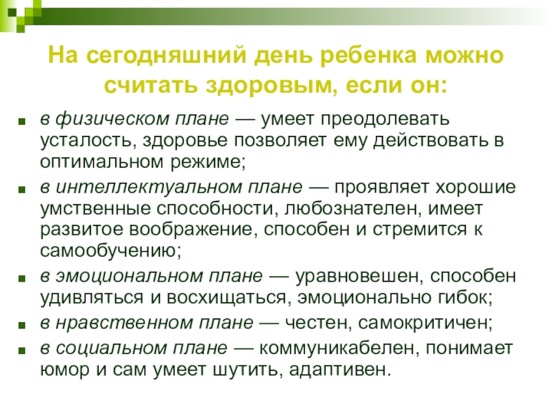 Слайд 20На сегодняшний день ребенка можно считать здоровым, если он: