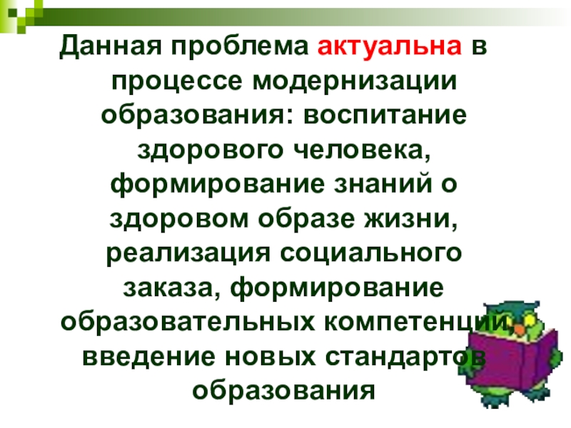 Слайд 4Данная проблема актуальна в процессе модернизации образования: воспитание здорового человека, формирование