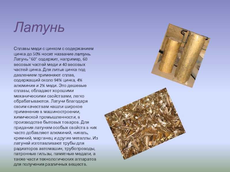 латунь. Латунь "60" содержит, например, 60 весовых частей меди и 40 весовых частей цинка. Для литья цинка под давлением применяют сплав, содержащий около 94% цинка, 4% алюминия и 2% меди. Это дешевые сплавы, обладают хорошими механическими свойствами, легко обрабатываются. Латуни благодаря своим качествам нашли широкое применение в машиностроении, химической промышленности, в производстве бытовых товаров. Для придания латуням особых свойств в них часто добавляют алюминий, никель, кремний, марганец и другие металлы. Из латуней изготавливают трубы для радиаторов автомашин, трубопроводы, патронные гильзы, памятные медали, а также части технологических аппаратов для получения различных веществ.