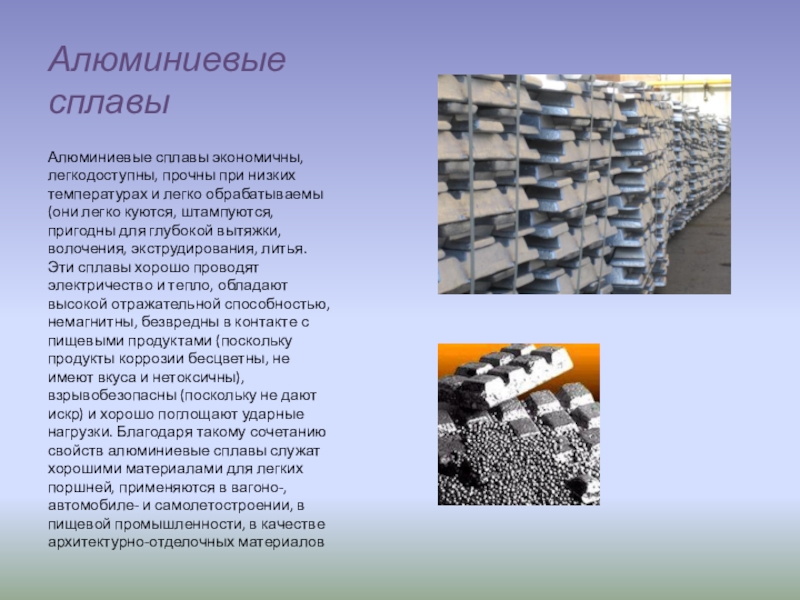 обрабатываемы (они легко куются, штампуются, пригодны для глубокой вытяжки, волочения, экструдирования, литья. Эти сплавы хорошо проводят электричество и тепло, обладают высокой отражательной способностью, немагнитны, безвредны в контакте с пищевыми продуктами (поскольку продукты коррозии бесцветны, не имеют вкуса и нетоксичны), взрывобезопасны (поскольку не дают искр) и хорошо поглощают ударные нагрузки. Благодаря такому сочетанию свойств алюминиевые сплавы служат хорошими материалами для легких поршней, применяются в вагоно-, автомобиле- и самолетостроении, в пищевой промышленности, в качестве архитектурно-отделочных материалов