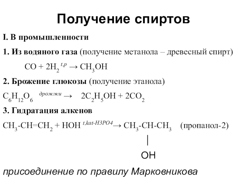 1. Из водяного газа (получение метанола – древесный спирт)