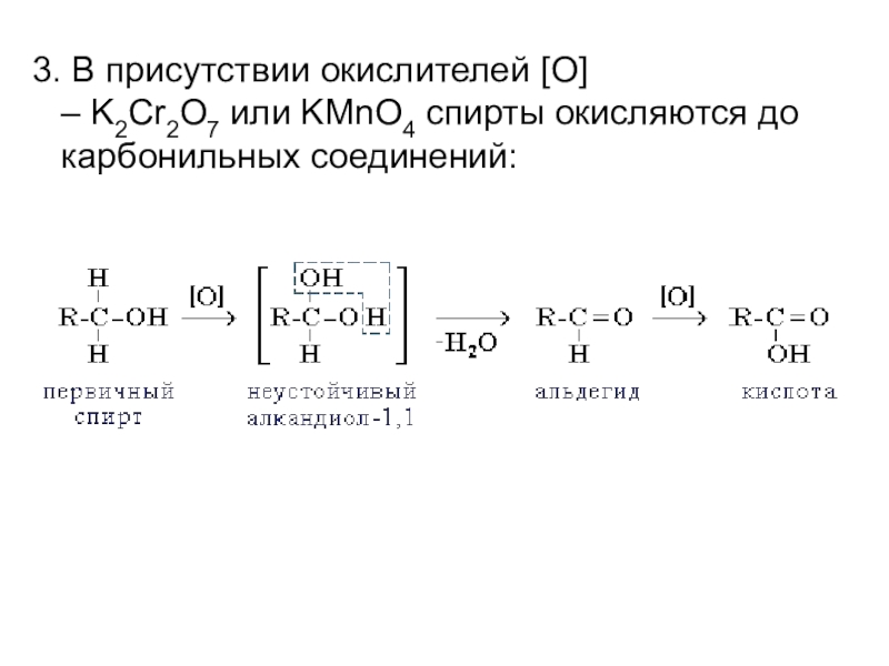 Слайд 183. В присутствии окислителей [O] – K2Cr2O7 или KMnO4 спирты окисляются до карбонильных соединений: