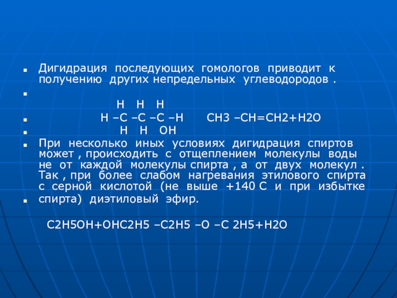 Дигидрация последующих гомологов приводит к получению других непредельных углеводородов .