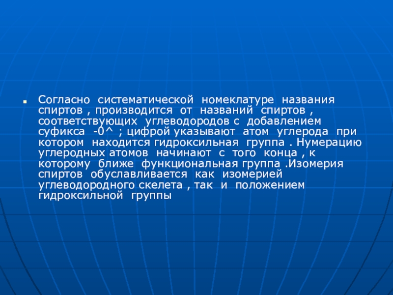 соответствующих углеводородов с добавлением суфикса -0^ ; цифрой указывают атом углерода при котором находится гидроксильная группа . Нумерацию углеродных атомов начинают с того конца , к которому ближе функциональная группа .Изомерия спиртов обуславливается как изомерией углеводородного скелета , так и положением гидроксильной группы
