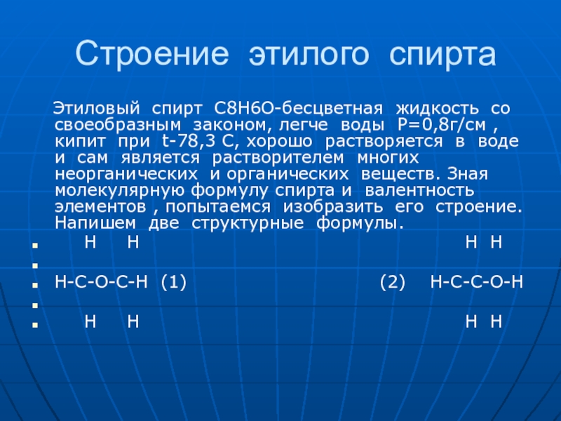 законом, легче воды Р=0,8г/см , кипит при t-78,3 С, хорошо растворяется в воде и сам является растворителем многих неорганических и органических веществ. Зная молекулярную формулу спирта и валентность элементов , попытаемся изобразить его строение. Напишем две структурные формулы.