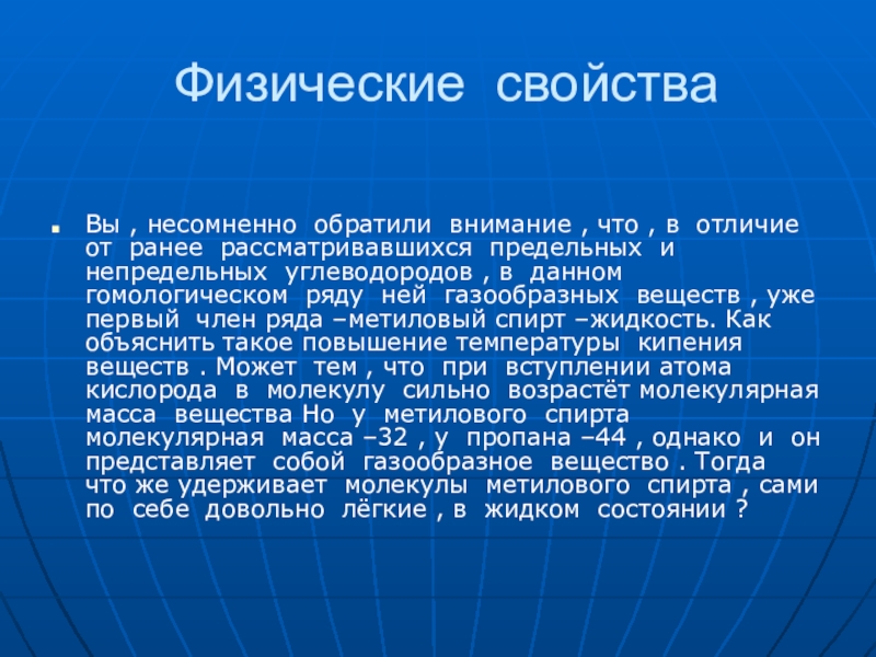 отличие от ранее рассматривавшихся предельных и непредельных углеводородов , в данном гомологическом ряду ней газообразных веществ , уже первый член ряда –метиловый спирт –жидкость. Как объяснить такое повышение температуры кипения веществ . Может тем , что при вступлении атома кислорода в молекулу сильно возрастёт молекулярная масса вещества Но у метилового спирта молекулярная масса –32 , у пропана –44 , однако и он представляет собой газообразное вещество . Тогда что же удерживает молекулы метилового спирта , сами по себе довольно лёгкие , в жидком состоянии ?