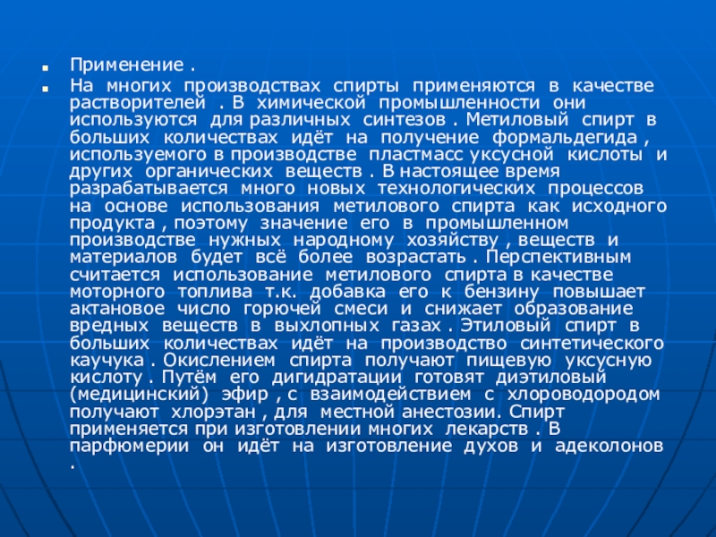 химической промышленности они используются для различных синтезов . Метиловый спирт в больших количествах идёт на получение формальдегида , используемого в производстве пластмасс уксусной кислоты и других органических веществ . В настоящее время разрабатывается много новых технологических процессов на основе использования метилового спирта как исходного продукта , поэтому значение его в промышленном производстве нужных народному хозяйству , веществ и материалов будет всё более возрастать . Перспективным считается использование метилового спирта в качестве моторного топлива т.к. добавка его к бензину повышает актановое число горючей смеси и снижает образование вредных веществ в выхлопных газах . Этиловый спирт в больших количествах идёт на производство синтетического каучука . Окислением спирта получают пищевую уксусную кислоту . Путём его дигидратации готовят диэтиловый (медицинский) эфир , с взаимодействием с хлороводородом получают хлорэтан , для местной анестозии. Спирт применяется при изготовлении многих лекарств . В парфюмерии он идёт на изготовление духов и адеколонов .
