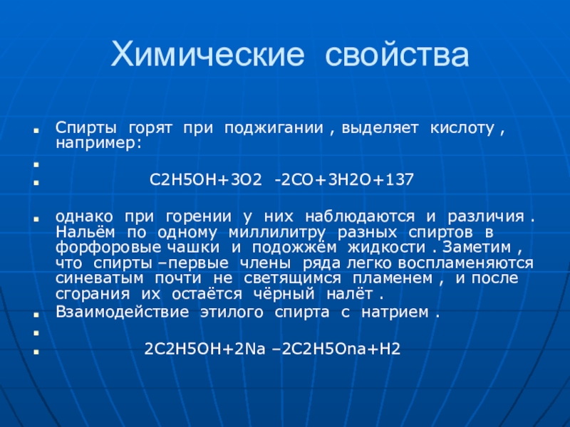 однако при горении у них наблюдаются и различия . Нальём по одному миллилитру разных спиртов в форфоровые чашки и подожжём жидкости . Заметим , что спирты –первые члены ряда легко воспламеняются синеватым почти не светящимся пламенем , и после сгорания их остаётся чёрный налёт .