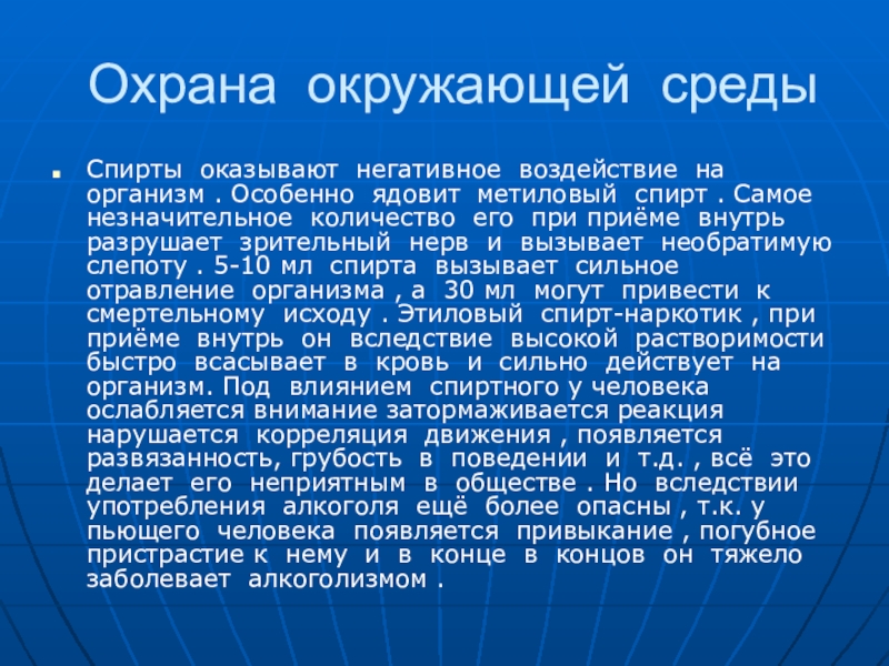 ядовит метиловый спирт . Самое незначительное количество его при приёме внутрь разрушает зрительный нерв и вызывает необратимую слепоту . 5-10 мл спирта вызывает сильное отравление организма , а 30 мл могут привести к смертельному исходу . Этиловый спирт-наркотик , при приёме внутрь он вследствие высокой растворимости быстро всасывает в кровь и сильно действует на организм. Под влиянием спиртного у человека ослабляется внимание затормаживается реакция нарушается корреляция движения , появляется развязанность, грубость в поведении и т.д. , всё это делает его неприятным в обществе . Но вследствии употребления алкоголя ещё более опасны , т.к. у пьющего человека появляется привыкание , погубное пристрастие к нему и в конце в концов он тяжело заболевает алкоголизмом .