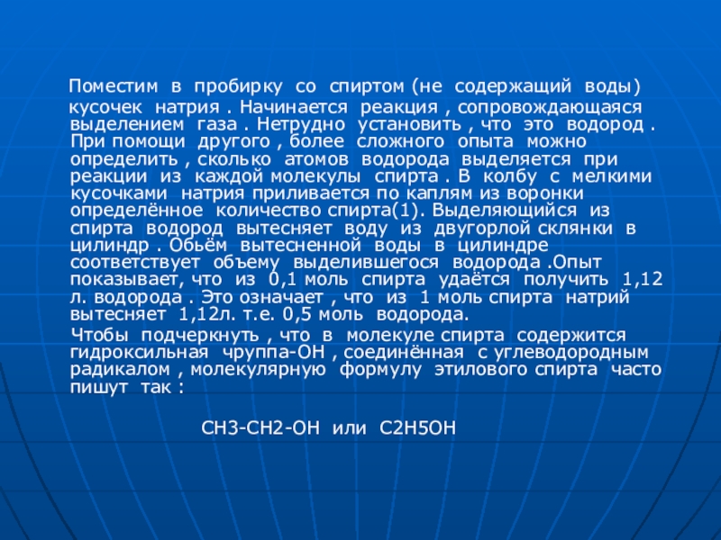 кусочек натрия . Начинается реакция , сопровождающаяся выделением газа . Нетрудно установить , что это водород . При помощи другого , более сложного опыта можно определить , сколько атомов водорода выделяется при реакции из каждой молекулы спирта . В колбу с мелкими кусочками натрия приливается по каплям из воронки определённое количество спирта(1). Выделяющийся из спирта водород вытесняет воду из двугорлой склянки в цилиндр . Обьём вытесненной воды в цилиндре соответствует объему выделившегося водорода .Опыт показывает, что из 0,1 моль спирта удаётся получить 1,12л. водорода . Это означает , что из 1 моль спирта натрий вытесняет 1,12л. т.е. 0,5 моль водорода.