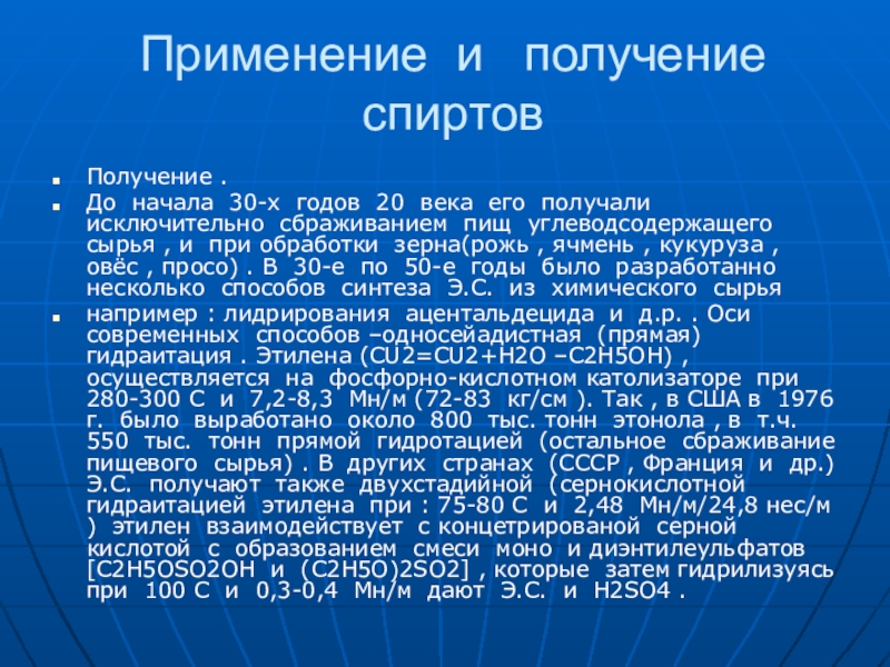 века его получали исключительно сбраживанием пищ углеводсодержащего сырья , и при обработки зерна(рожь , ячмень , кукуруза , овёс , просо) . В 30-е по 50-е годы было разработанно несколько способов синтеза Э.С. из химического сырья