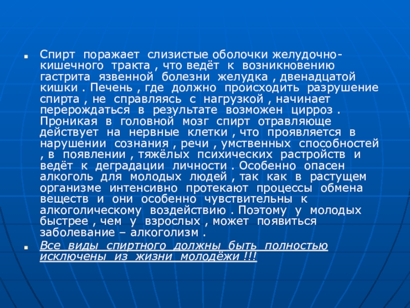 гастрита язвенной болезни желудка , двенадцатой кишки . Печень , где должно происходить разрушение спирта , не справляясь с нагрузкой , начинает перерождаться в результате возможен цирроз . Проникая в головной мозг спирт отравляюще действует на нервные клетки , что проявляется в нарушении сознания , речи , умственных способностей , в появлении , тяжёлых психических растройств и ведёт к деградации личности . Особенно опасен алкоголь для молодых людей , так как в растущем организме интенсивно протекают процессы обмена веществ и они особенно чувствительны к алкоголическому воздействию . Поэтому у молодых быстрее , чем у взрослых , может появиться заболевание – алкоголизм .