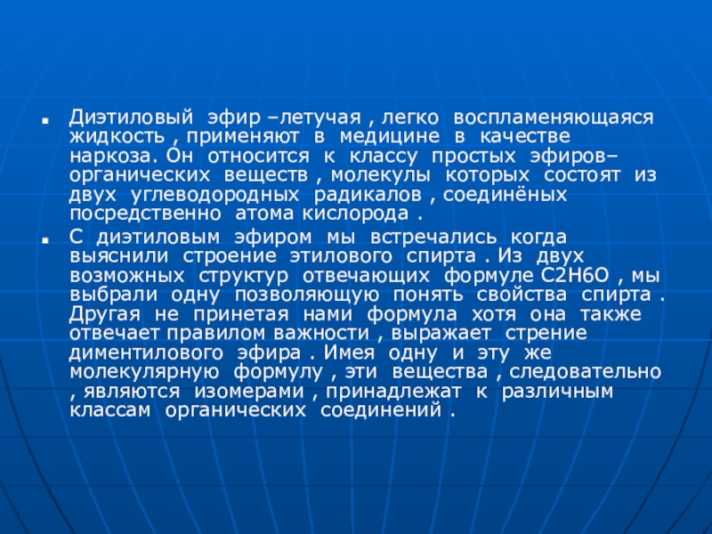 в качестве наркоза. Он относится к классу простых эфиров–органических веществ , молекулы которых состоят из двух углеводородных радикалов , соединёных посредственно атома кислорода .