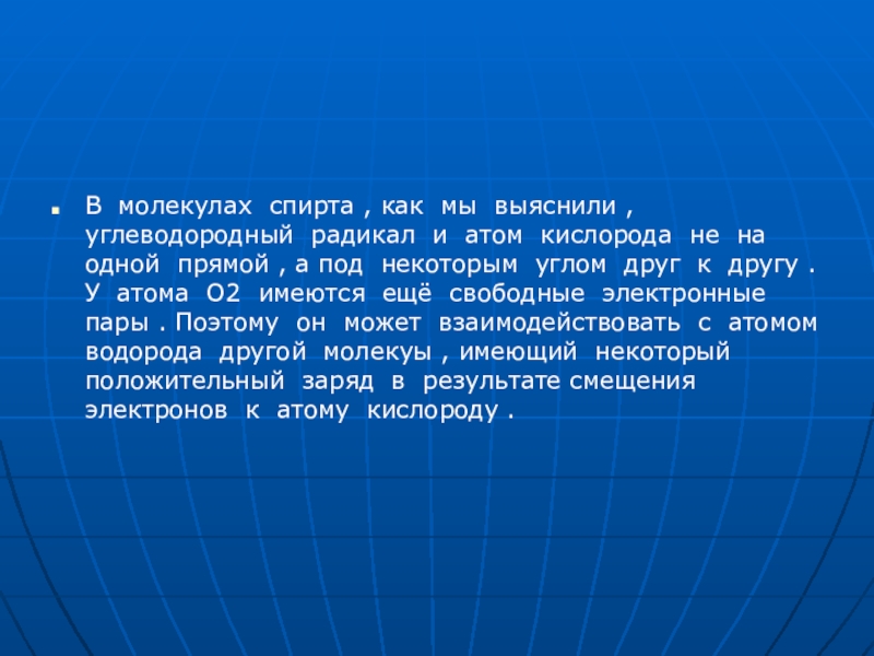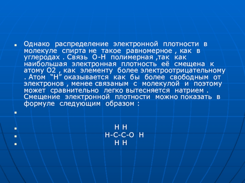 Однако распределение электронной плотности в молекуле спирта не такое равномерное ,