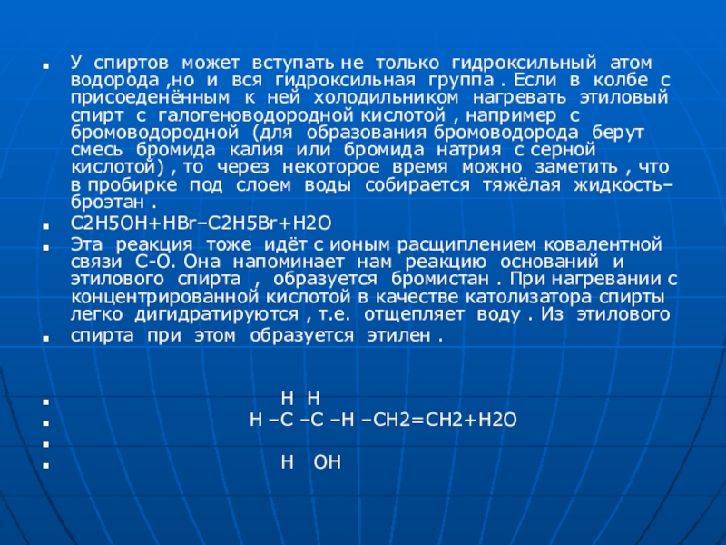 Эта реакция тоже идёт с ионым расщиплением ковалентной связи С-О. Она напоминает нам реакцию оснований и этилового спирта , образуется бромистан . При нагревании с концентрированной кислотой в качестве католизатора спирты легко дигидратируются , т.е. отщепляет воду . Из этилового
