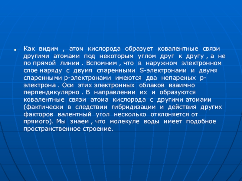 некоторым углом друг к другу , а не по прямой линии . Вспомним , что в наружном электронном слое наряду с двумя спаренными S-электронами и двумя спаренными р-электронами имеются два непареных р-электрона . Оси этих электронных облаков взаимно перпендикулярно . В направлении их и образуются ковалентные связи атома кислорода с другими атомами (фактически в следствии гибридизации и действия других факторов валентный угол несколько отклоняется от прямого). Мы знаем , что молекуле воды имеет подобное пространственное строение.