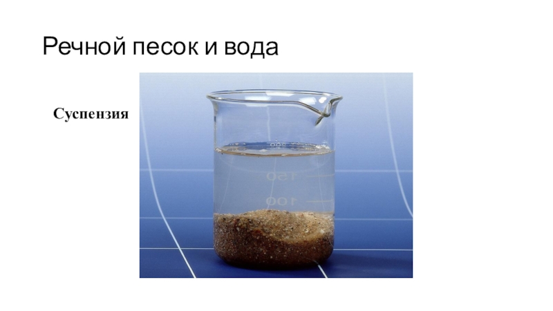 Слайд 17Суспензия – смесь речного песка с водой – отстаивание.