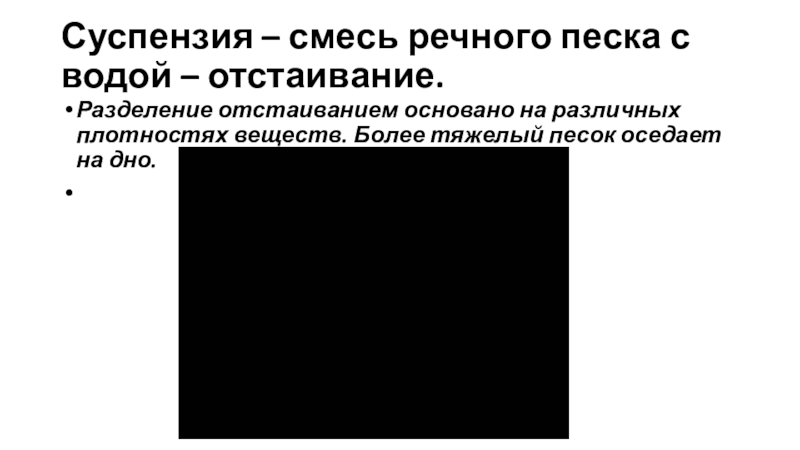 Суспензия – смесь речного песка с водой – отстаивание.Разделение отстаиванием основано на различных плотностях веществ. Более тяжелый песок оседает
