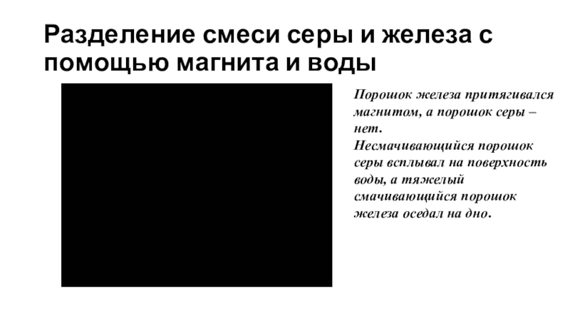 Разделение смеси серы и железа с помощью магнита и водыПорошок железа притягивался магнитом, а порошок серы –