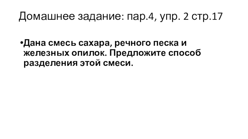 Домашнее задание: пар.4, упр. 2 стр.17  Дана смесь сахара, речного песка и железных опилок. Предложите способ